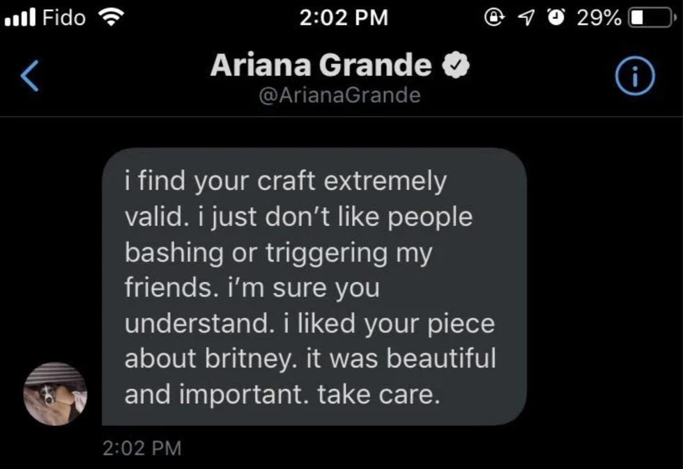 "Grande kept DM'ing me to reassure me that she writes her songs and then about her PTSD. I made sure to validate her feelings, told her healing isn't linear, and recommended a book."