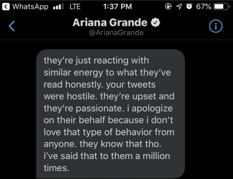 "I'm aware that Ariana Grande can't control all of her fans and followers. However, pretending like she has 0 influence over her stans is disingenuous and irresponsible."