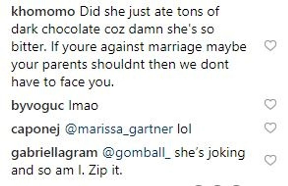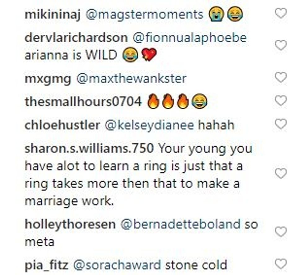 In an Instagram post on by the The Zoe Report giving tips on picking out engagement rings, Grande commented with one word, "Don't."