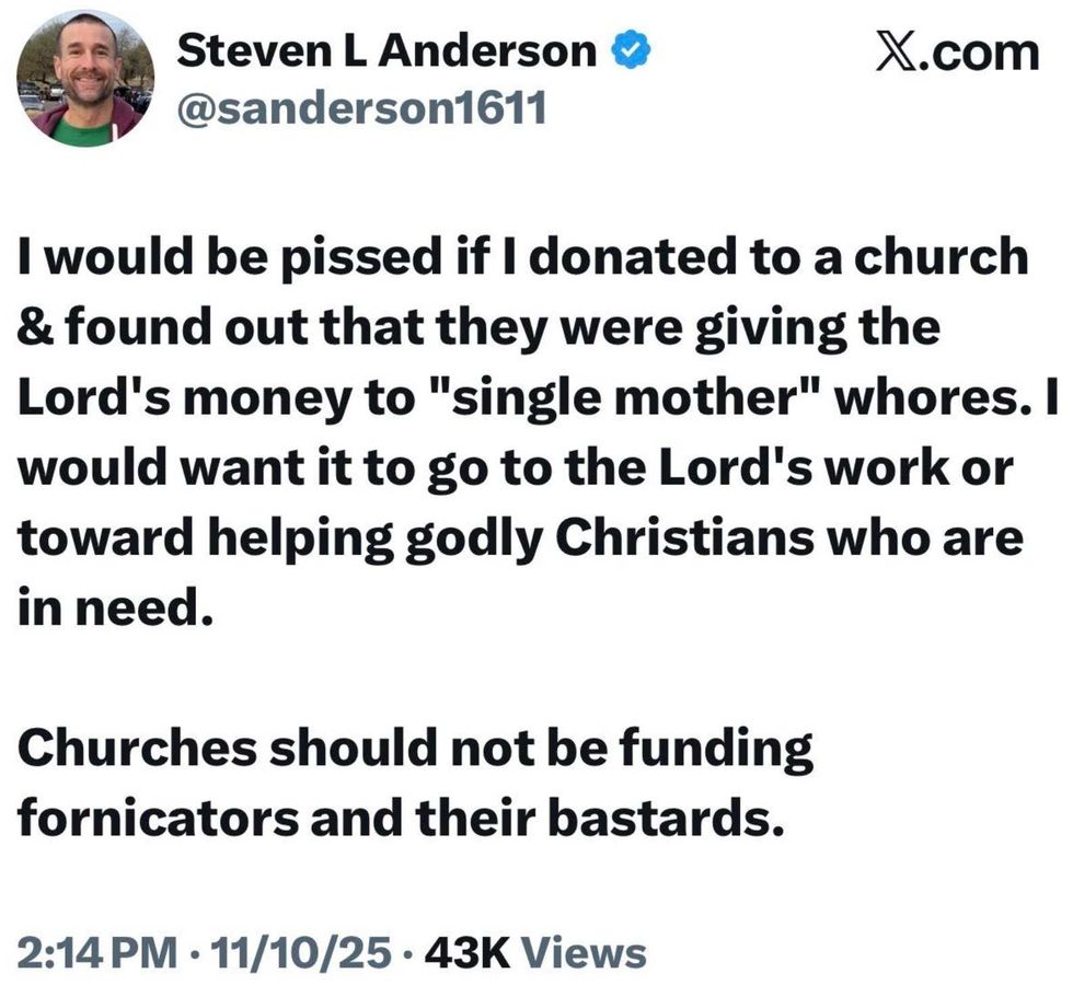 "I would be pissed if I donated to a church & found out that they were giving the Lord’s money to ‘single mother’ whores. I would want it to go to the Lord’s work or toward helping godly Christians who are in need."