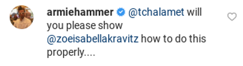 In a truly teachable moment for how to use peaches, Hammer tagged his former co-star, Timothée Chalamet, in a shout-out to Kravitz.