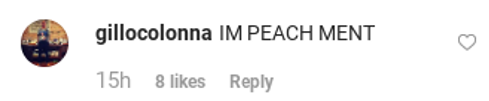 At the end of the caption is a peach emoji, which has become a symbol all across the internet for Trump's im=peach-ment.