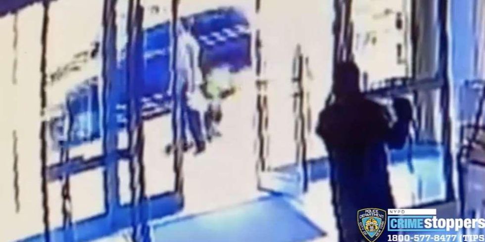Recorded on video surveillance from an apartment building in Manhattan, the woman can be seen stopping suddenly and then being repeatedly kicked.