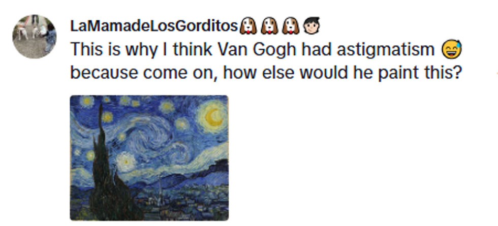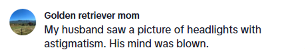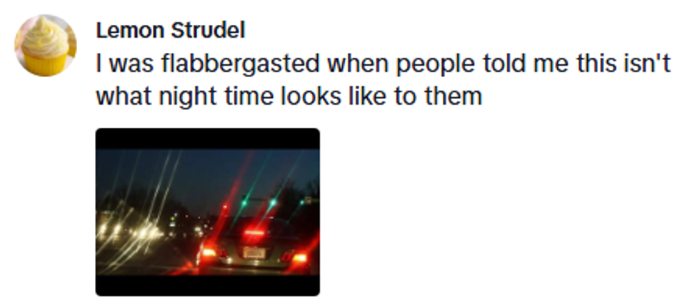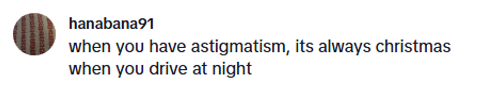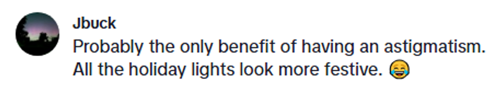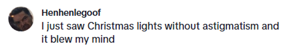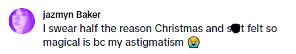 A fellow TikToker, @randomthoughts2226, came across the original astigmatism video and was shocked, realizing that there was a different way to view Christmas lights, traffic jam taillights, and more.