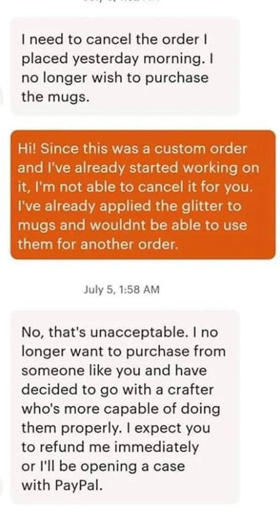 "Man forget that. If I had the money, I would buy all the mugs the crafter wanted to make me. Karma will get her."