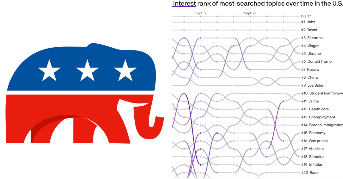 According to the latest data in Axios' midterm dashboard, issues such as crime, immigration, and inflation—issues that are typically favorable to Republicans—are in the bottom half of Google searches.