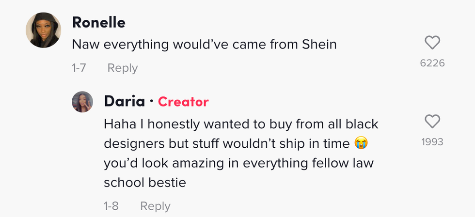 Daria said in the comments that she had wanted to purchase her outfits exclusively from Black designers but shipping delays prevented her from being able to do so because they would not have arrived in time for filming.