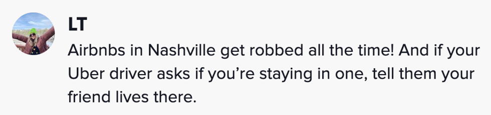 “Bach party in Austin––> emergency evacuating our [apartment] in the middle of the night, cause we realized we were being set up to be robbed and/or worse when the doors didn't lock, alarm system was dead, owner didn't respond."