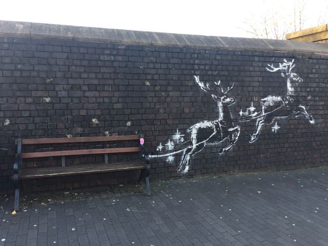 The latest mural from the secretive street artist features two reindeer painted onto a brick wall appearing to pull along a bench on Vyse Street in the city's Jewellery Quarter like Santa's sleigh.