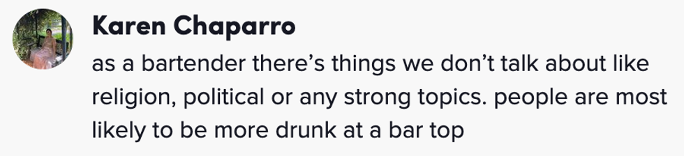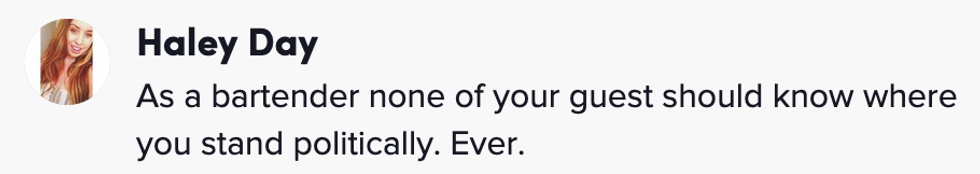 "Coming from someone that works at a bar as a bartender, I would have been fired if I gave my political view to any of my customers."