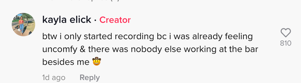 Elick clarified her reasons for recording this encounter in the video's comments section, explaining she was uncomfortable and manning the bar all on her own.