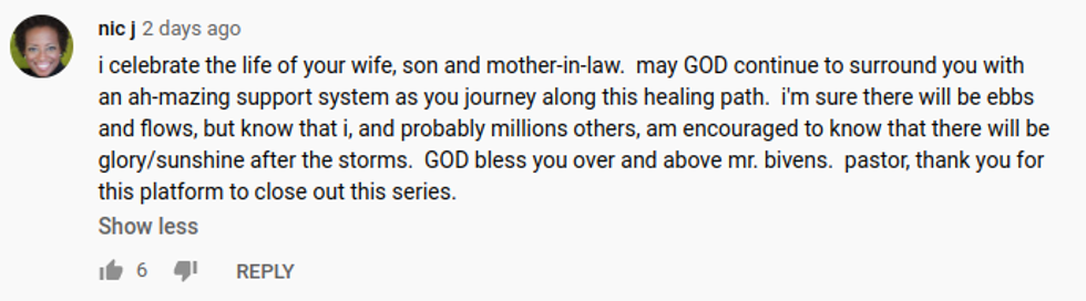 The Youtube comments for Bivens' appearance at River Church were filled with condolences and messages of support.