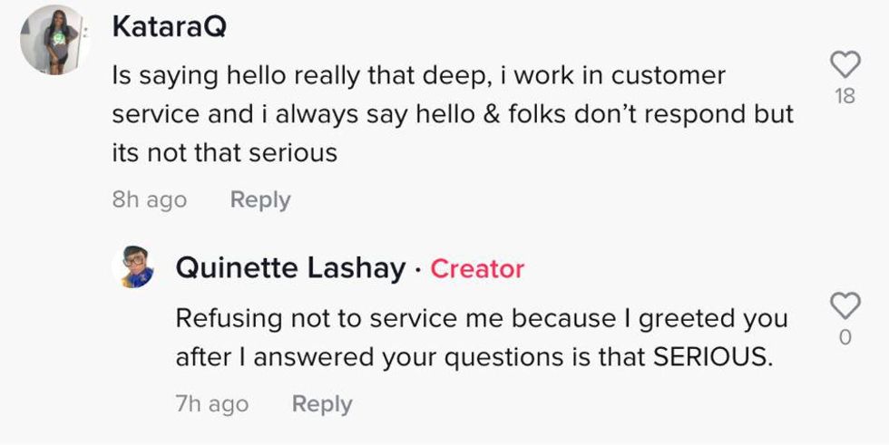 The disagreement was over how the employee greeted Lashay. When Lashay said "Hello," the employee just replied "cash or card."