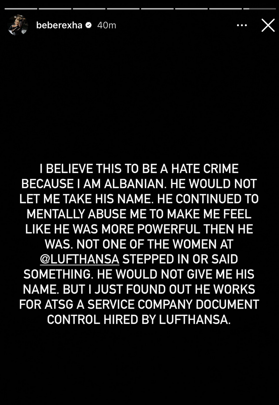 Singer Bebe Rexha called her recent banning from a Lufthansa flight as a "hate crime" after she spoke to a male airport security agent in Albanian, assuming he also spoke the language.