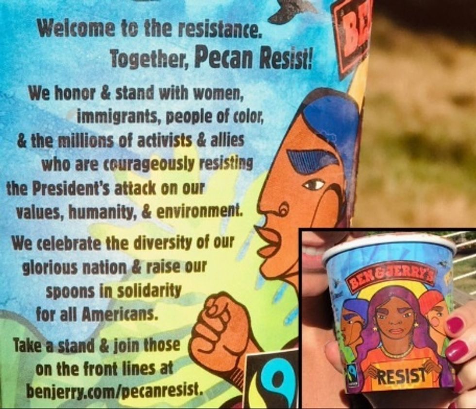 The name: Pecan Resist. The container art features women holding up a resist sign and has a paragraph written about the message Ben & Jerry's wanted to send.