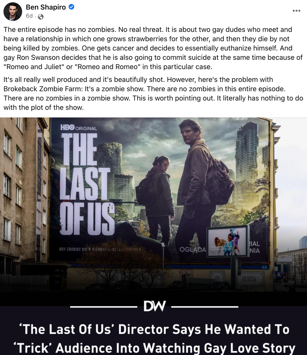 Conservative political commentator and noted homophobe Ben Shapiro did not approve of the acclaimed third episode of HBO's The Last of Us because it lacked any presence of zombies and instead focused on a heartbreaking storyline featuring a gay couple.