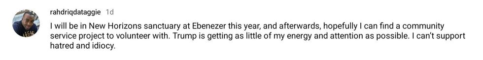 "I am glad the inauguration coincides with the King holiday because this nation will be confronted with the sharp contrast between my father, who espoused love and justice, and Trump, who has often sanctions [sic] hate and injustice."