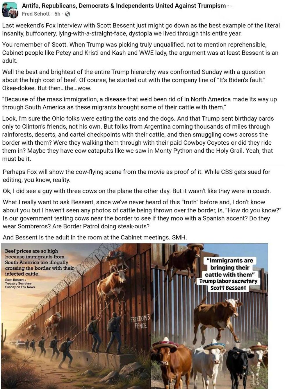 He highlighted the repeatedly disproven campaign lie about immigrants eating pets in Ohio and the denial of Trump's close association with registered sex offender Jeffrey Epstein, before mocking Bessent's ridiculous excuse for rising costs caused by Trump's losing trade wars and complete ignorance of how tariffs work.