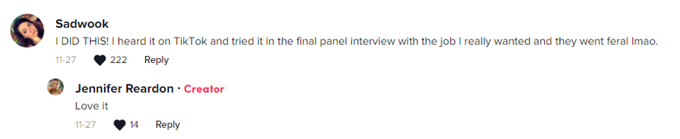 That's what communications director and consultant Jennifer Reardon was going for on her TikTok channel, @notjenneeree, when she disclosed the question she claimed would land the job every time.
