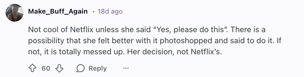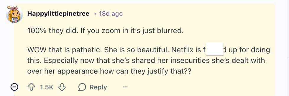 "Why are we still photoshopping bodies in 2026? Erasing this part of her is sending the wrong message. Foul Netflix.”