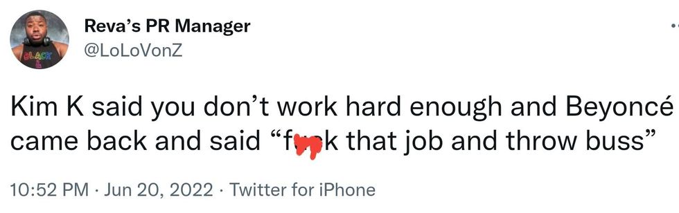 \u201cMe quitting my job because Beyonc\u00e9 told me to\u201d— LEX (@LEX) 1655785612