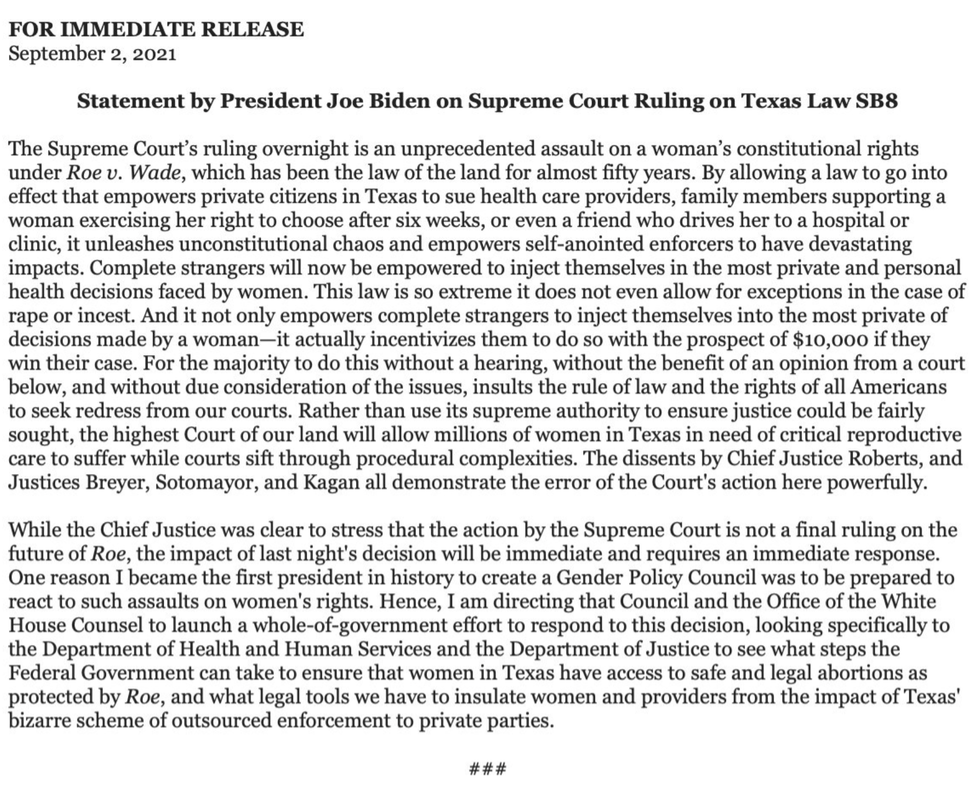 Texas SB8 will impair women's access to health care and, outrageously, deputizes private citizens to sue those they believe helped another person get a banned abortion. \n\nIt's a blatant violation of the right established under Roe V. Wade. We will protect and defend that right.— President Biden (@President Biden) 1630520138