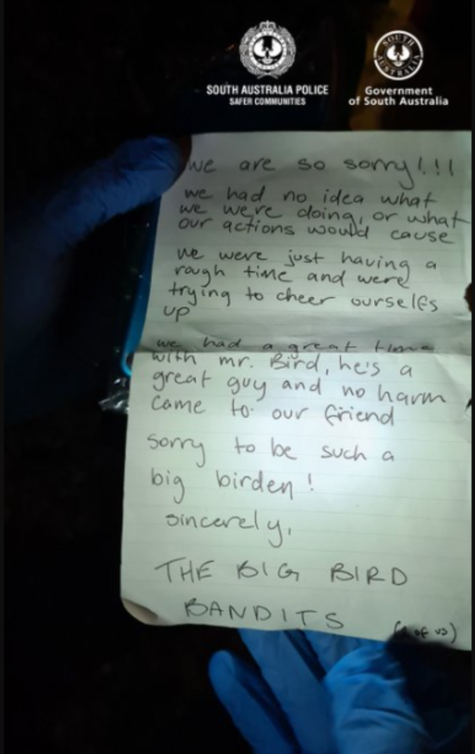 The Southern Australian Police Department was called on the matter and decided to look into it, later putting out a call to be on the lookout for two thieves, who witnesses saw carting the bird costume.