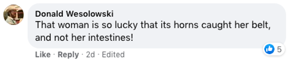 Other cyclists can be seen running toward the woman as a buffalo swings her around several times by its horns. The woman then flies out of her pants and lays still in the grass, and the herd of buffalo run off.