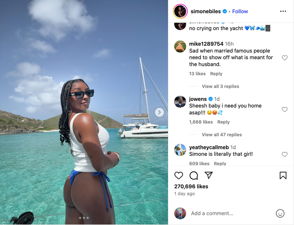 The photos she chose to post are quite revealing, as Biles had opted for a more thong cut of bikini bottom in this instance. This did not go unnoticed, especially by Biles' own husband, Jonathan Owens.