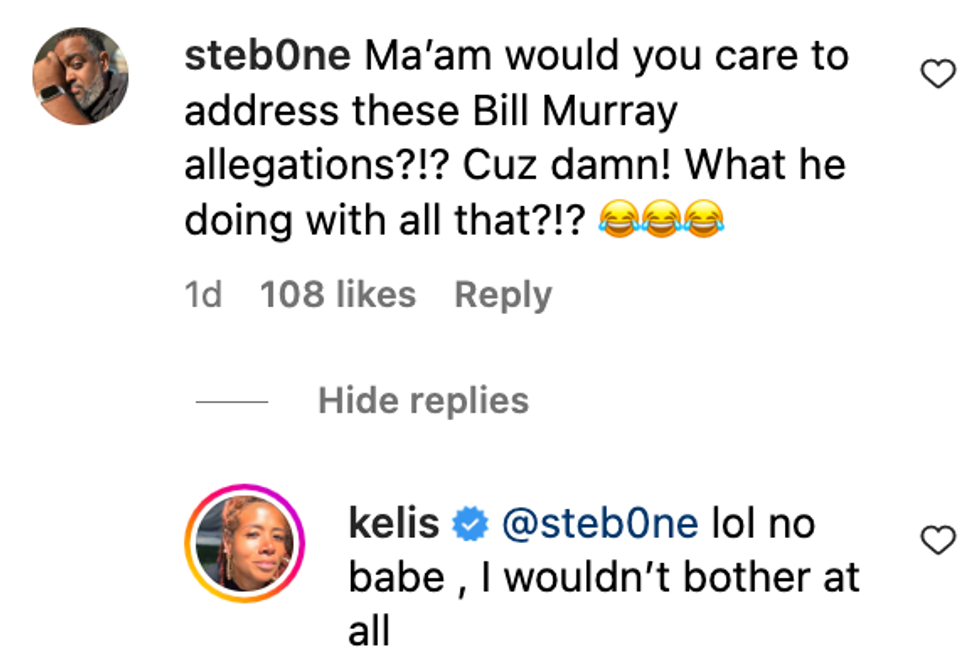 \u201cJust heard Kelis and Bill Murray are dating \ud83d\ude33\u201d— Vittorio (@Vittorio) 1686318066