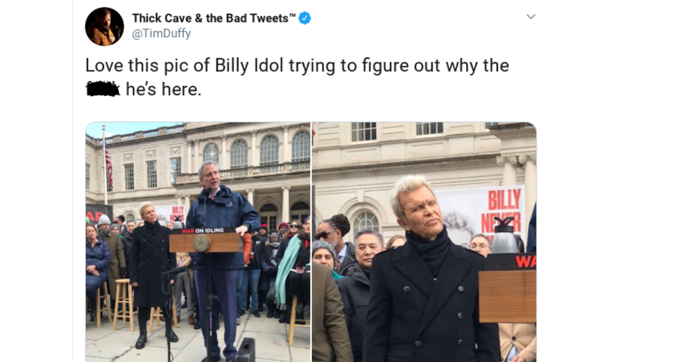 After some speechifying from de Blasio, where he gushed about Billy Idol's "bit of an EDGE" about 4 separate times, the punk rocker took the mic and advocated against letting the car run.