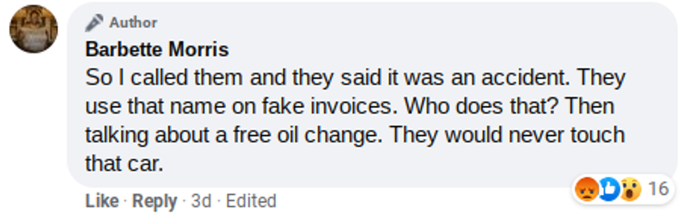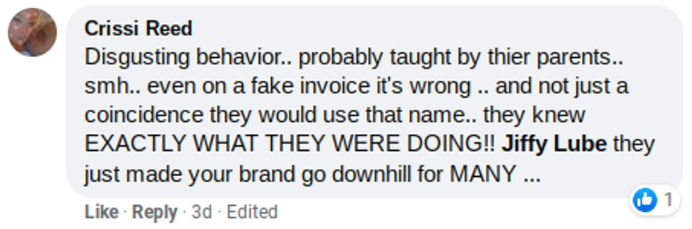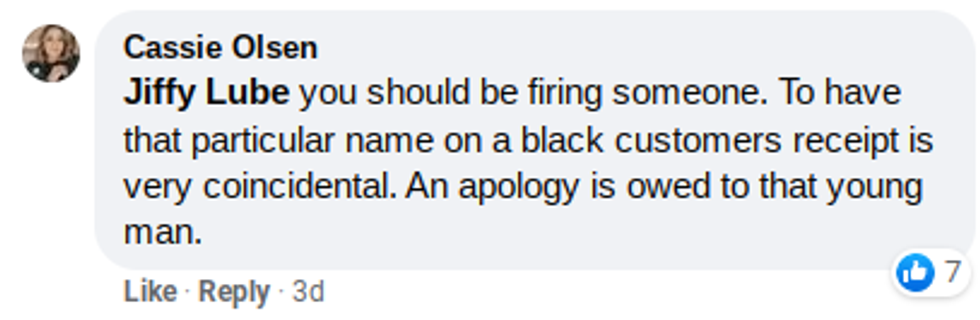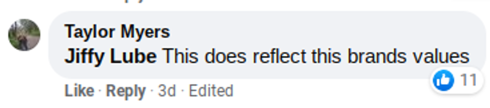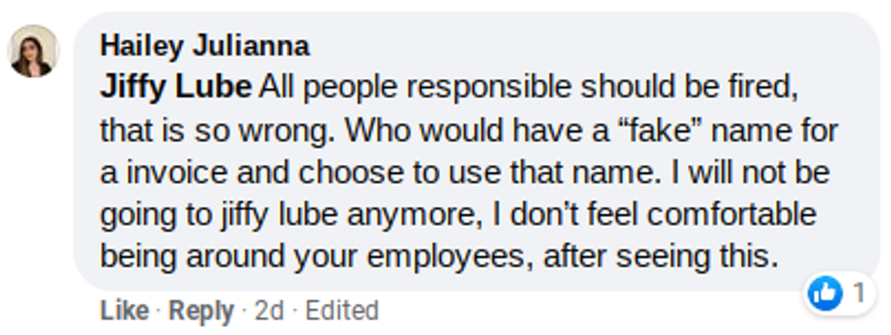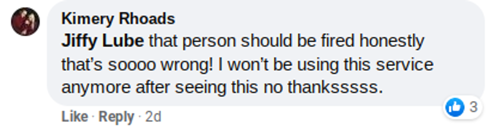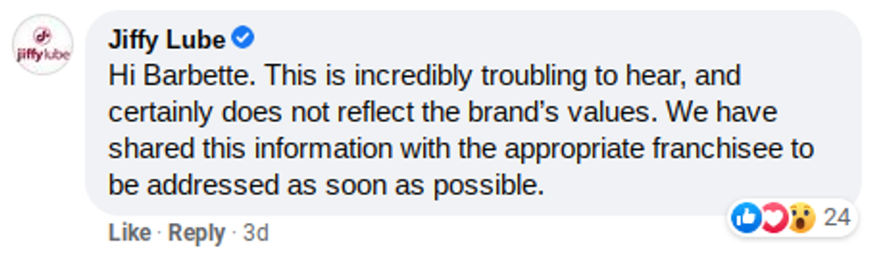 Jiffy Lube also responded to the post, stating the incident did not reflect their values.