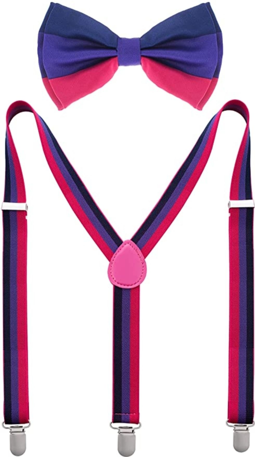 This bisexual pride bow tie and suspender set is available here. Also available in rainbow.