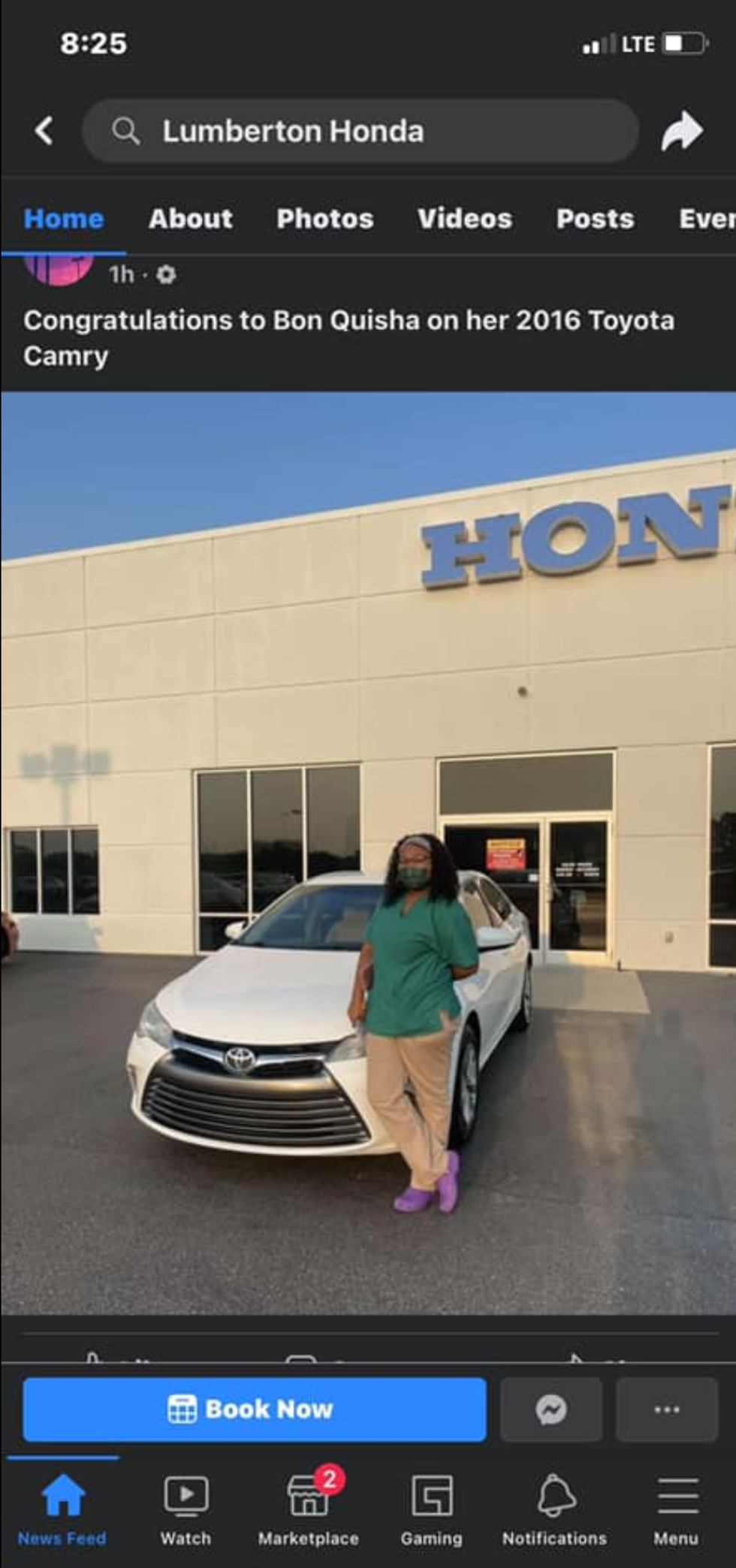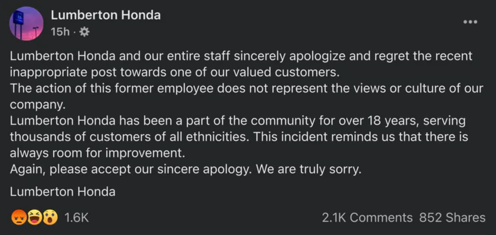 Below is a screenshot of the Lumberton Honda dealership's now-deleted post.