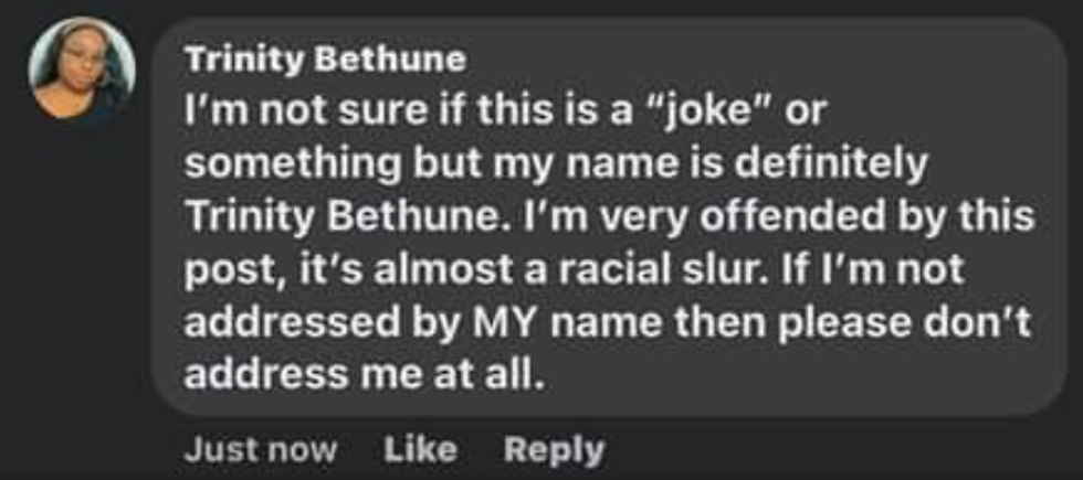 "I'm not sure if this is a 'joke' or something but my name is definitely Trinity Bethune," she said.