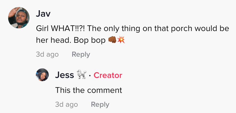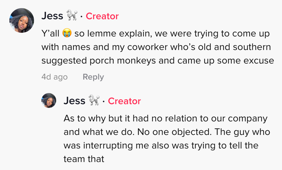 TikToker @curlyjess was fairly certain her coworker was not making a mistake when she suggested naming their job team "porch monkeys."
