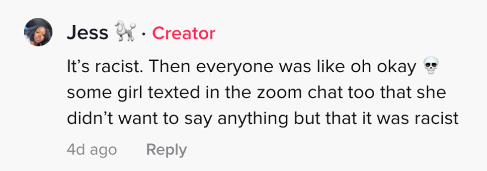 Her boss then also apologized for the situation in a private Zoom meeting later, and gave her the info to reach human resources.