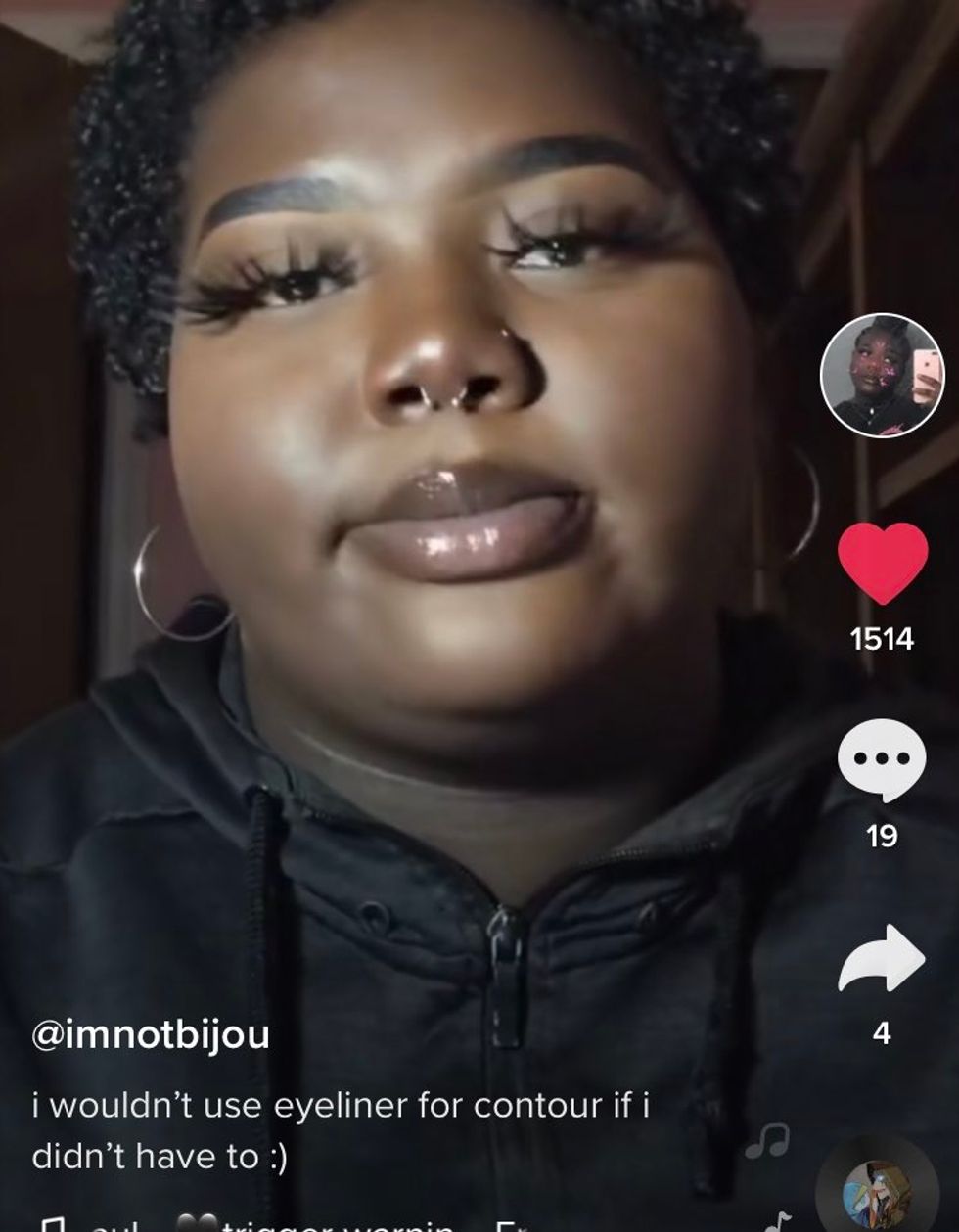 The woman in the video, TikTok user "imnotbijou," began her video with some typical steps: applying eyebrows and priming her face.