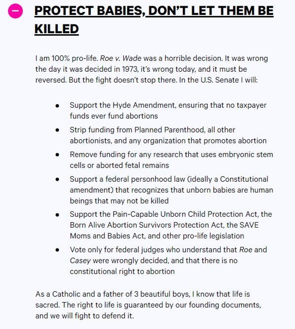 NBC News later reported the Masters campaign changed or deleted parts of its website and one of the sections axed included a statement supporting “a federal personhood law (ideally a Constitutional amendment) that recognizes that unborn babies are human beings that may not be killed.”