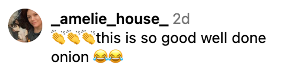 In the comments of The Onion's post, Bloom commented with a string of clapping emojis to give the satirical publication a hats-off for its joke.