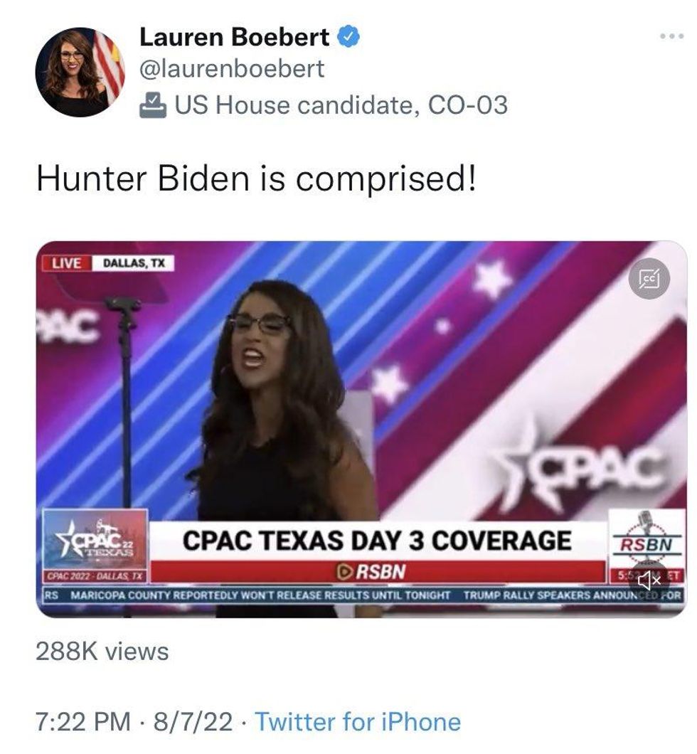 \u201cLauren Boerbert claims Hunter Biden is \u201ccomprised.\u201d Not sure what that means. However, she is a national security threat. She has ties to white supremacy groups & co-conspired with the Janurary 6th insurrection. Lauren Boerbert is the one who is compromised!\u201d— David Weissman (@David Weissman) 1659936560