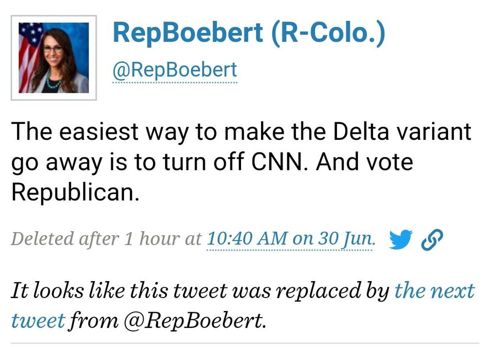 Boebert's district has a surge of the delta variant of CoVid, unvaccinated people are getting very sick and dying and she tweets this sh*t. Unbelievably ignorant and irresponsible.— Bear Lass (@Bear Lass) 1625065984