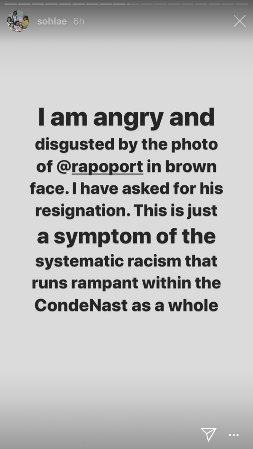 It said Rapoport wearing "brownface" was a "symptom of the systematic racism that runs rampant within the [Condé Nast] as a whole."