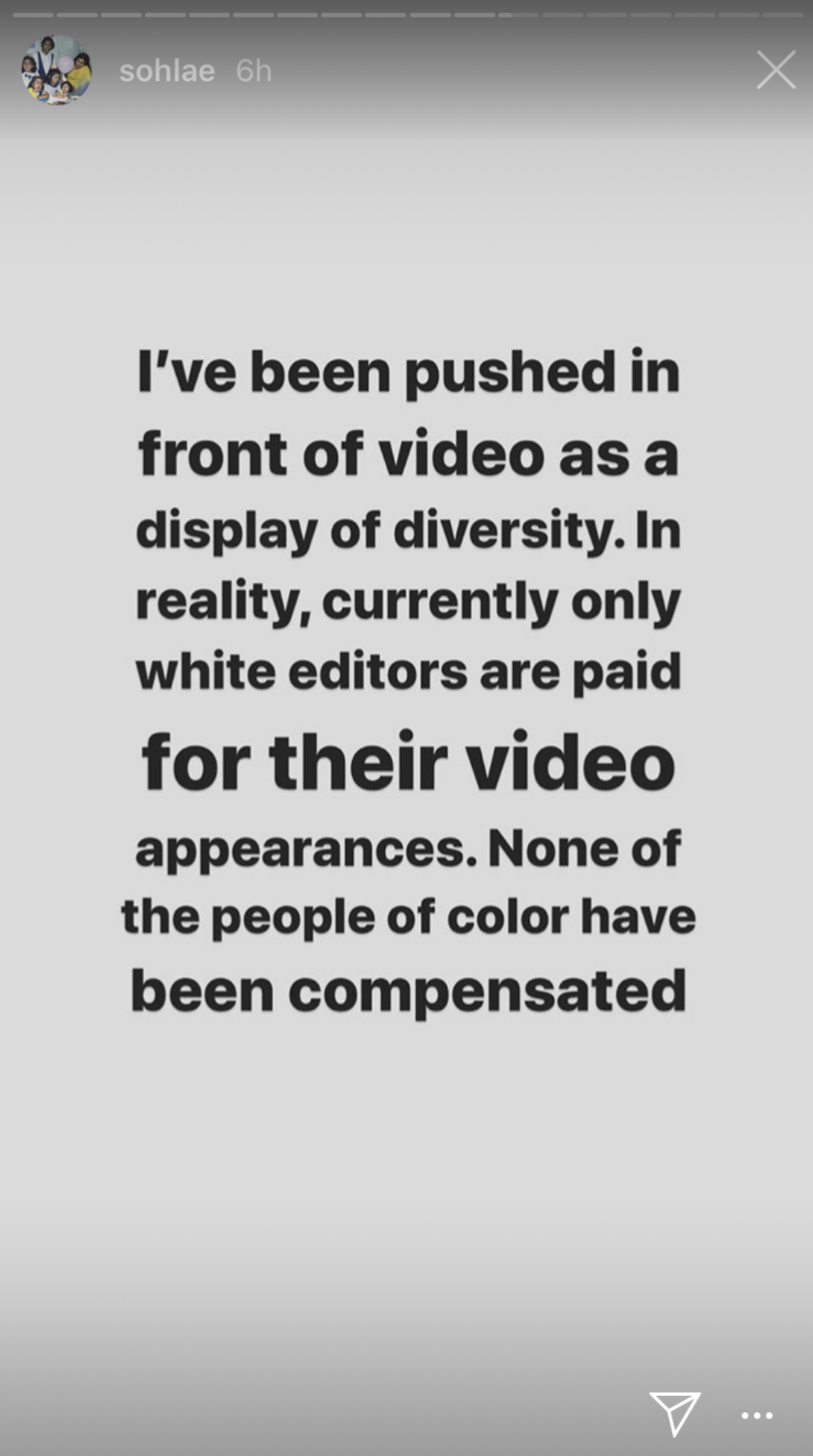 "I've been pushed in front of video as a display of diversity. In reality, currently only White editors are paid for their video appearances."