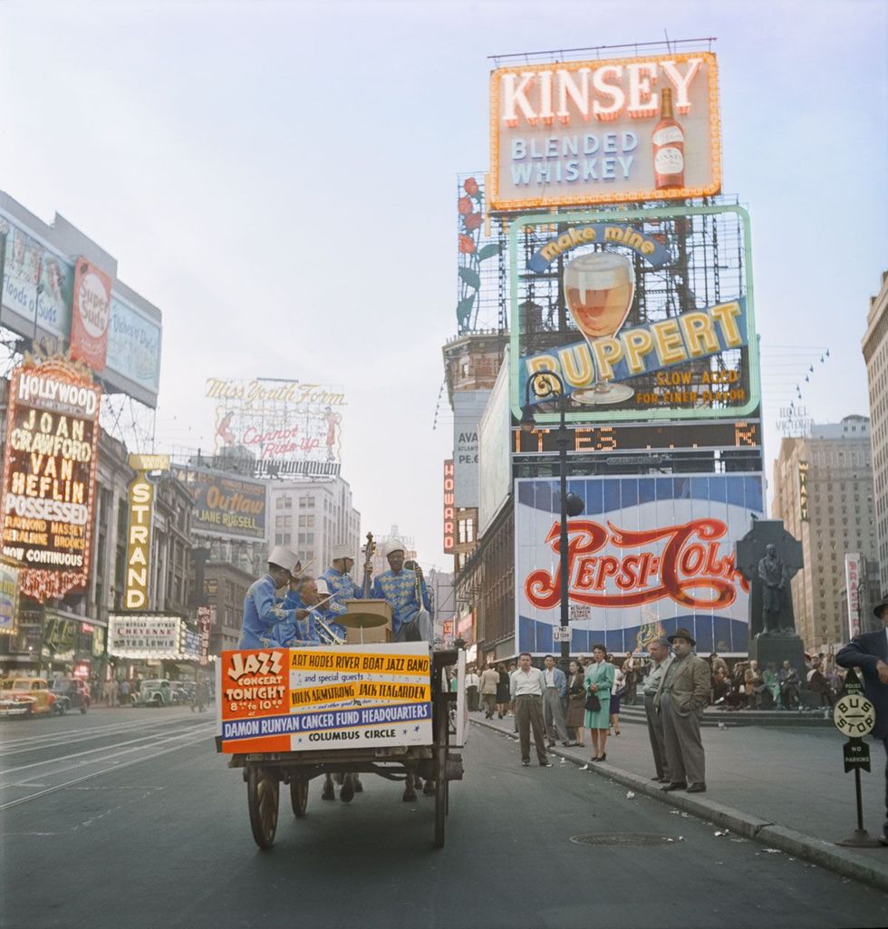 Here's another photo from New York City in 1947, which shows the River Boat Jazz Band making its way through Times Square on a horse-drawn carriage: