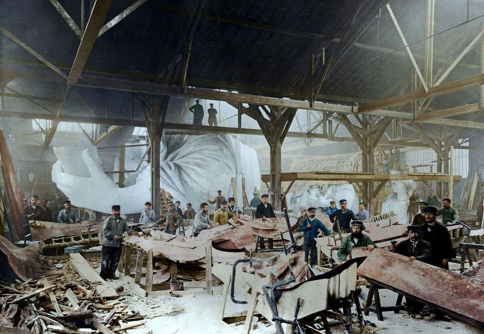 Another iconic image features the building of the Statue of Liberty in French sculptor Frederic Auguste Bartholdi's Paris workshop in 1882. The statue was supported internally with help from engineer Gustave Eiffel before being shipped to America in parts and reassembled for its dedication in 1886.