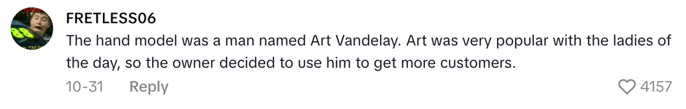 And in the sign’s defense, the same carved hand does appear on the restaurant’s official Instagram, meaning someone approved it, carved it, varnished it, and said, “Yes. This is the finger a drunk Sam Malone would’ve inappropriately flirted with.”