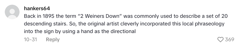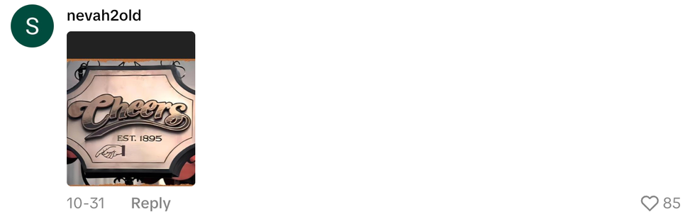 In her viral video, now at over 976,000 views, Elizabeth films herself staring at the sign like she’s trying to decode ancient runes. At the bottom of the wood-carved plaque, a hand directs visitors toward the bar. Except the thumb appears to have brought a smaller, sadder, limp companion along for support, much like Frasier Crane midway through an emotional spiral.