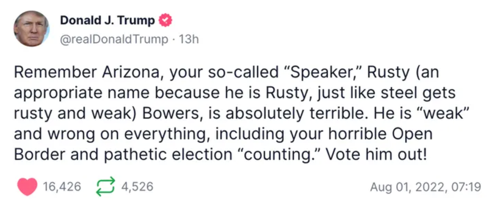 Trump called Bowers "absolutely terrible" and said he is "wrong on everything" affecting Arizona "including your horrible Open Border and pathetic election 'counting'."