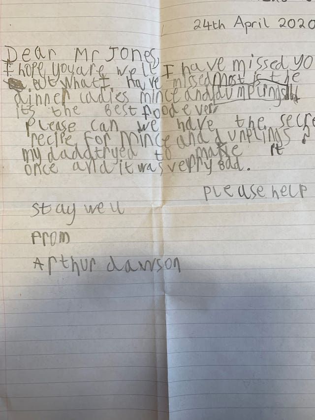 A schoolboy wrote to his headteacher asking for the recipe for his favorite school lunch when his father's lockdown attempt at mince and dumplings failed to come up to scratch.